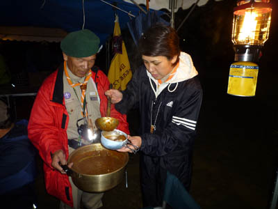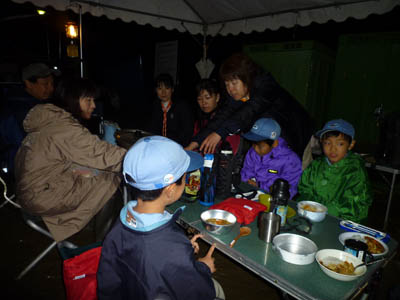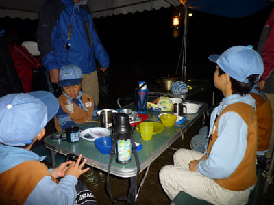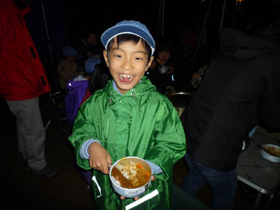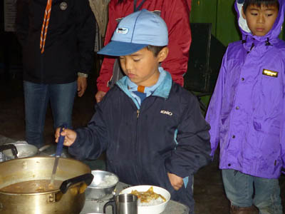 ▲カブ隊が班ごとにちがう味のカレーを作ったんだね。スゴイ! ▲すっかり食べる準備が出来ました。お腹空いたー。