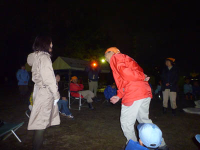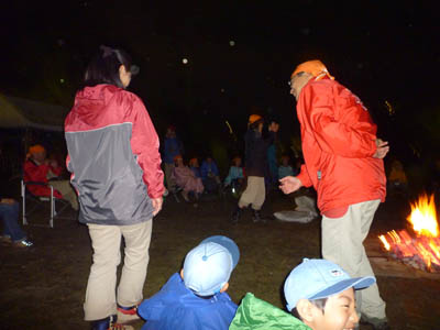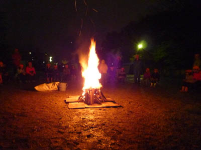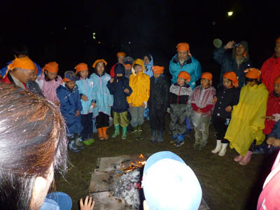 ▲いよいよお待ちかねの営火です。営火ってキャンプファイヤのことなんだね。▲ビーバー隊は御指名にあずかり、スタンツ「金色のガチョウ」ではなく「金色の隊長」をやりました。