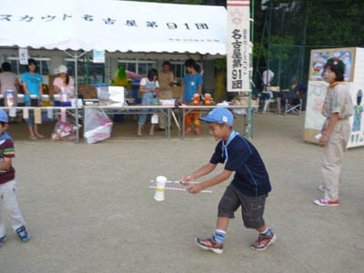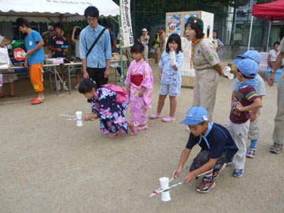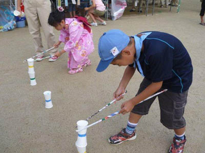 ▲まずは奉仕の”子供タイム”が始まるまでウォーミングアップでゲームをします。 ▲紙コップをくっつけたコマをチラシで作ったつえで動かして競争します。