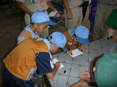 ▲会場のお友達とジャンケンをして優勝した子に賞品を渡します。”ジャンケンポン!” ▲その後は91団ローバー隊のお兄さんお姉さんに東北支援のボランティアに持って行ってもらう励ましのメッセージを書きました。