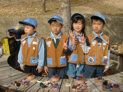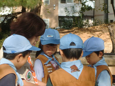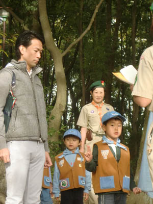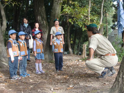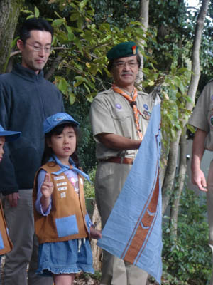 ▲入隊式です。ビーバー隊の隊旗を握ってちかいのことばをとなえます。 ▲今日から立派なビーバー隊の仲間です。