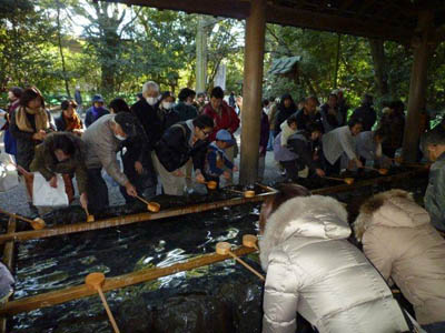 ▲地下鉄に乗って熱田神宮に着きました。注意事項を聞きます。 ▲手を清めて、いざお参りへ。