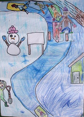 バスが着いて雪の造形作りをして僕たちの組は的当てゲームを作りました。他の組のゲームは難しかった。
