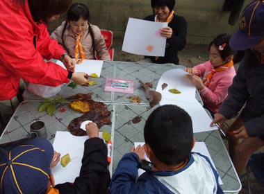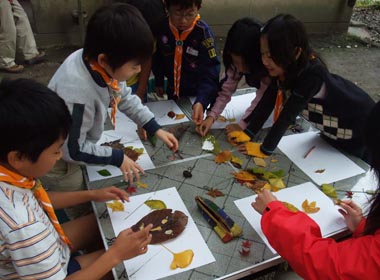 ハイキングの途中集めた「秋」を使って絵をつくる。
