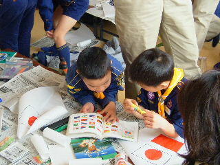 凧には世界の国旗を書いたよ。いろんな色・デザインの凧が出来上がる!あれれ、でも時間が・・・・・
