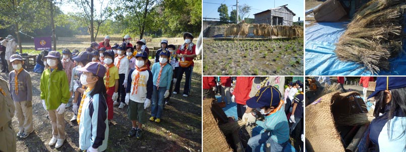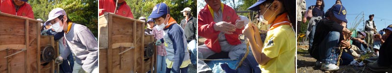 昔ながらの農具を使って、実際に脱穀の作業を体験。 脱穀の後に残った藁を使った縄作りにもチャレンジしました。