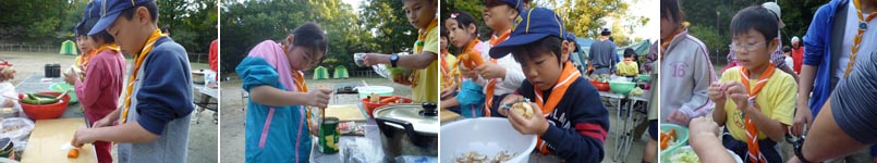 残ったスカウトは手分けしてカレーの具の野菜切り、サラダ作りを進めて行きます。