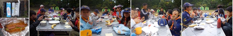 モーニングハイクの後の朝食メニューはホットドック牛乳パック焼き(?)。