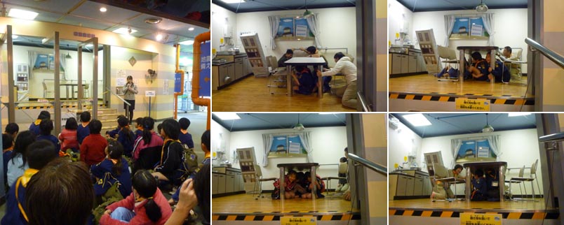 地震体験では、過去に起こった震災の揺れを再現。(関東大震災、阪神大震災など)