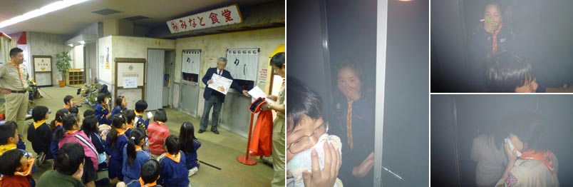 中は真っ暗で何も見えない状態。さらに煙も充満していてる中での実践的な非難訓練を体験。