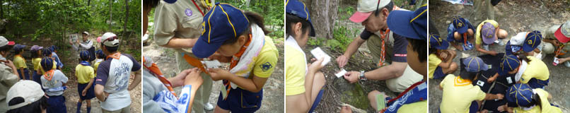 「色あわせ・色さがし」では、渡された日本の伝統色の色見本と名前で、グループに分かれて森の中からその色を探しました。