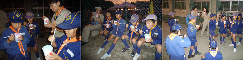 一仕事終えたスカウト達は、おやつの「カキ氷」を食べて一休み。