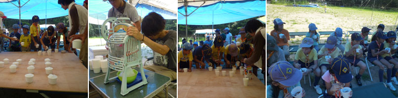 ブルーシートの屋根の下でカキ氷を食べました。(今回は特別にシロップは掛け放題!!)