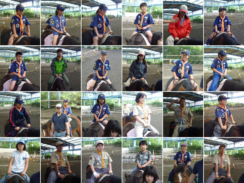 さあ、続いてはお楽しみの『乗馬体験』だ。初めて馬に乗るスカウトも何人かいる。