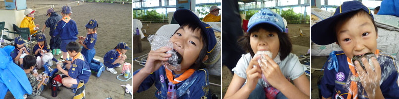 お昼はいつもの通りカブ弁だ。まだ雨が少し降っているので馬場の前で食べようね。