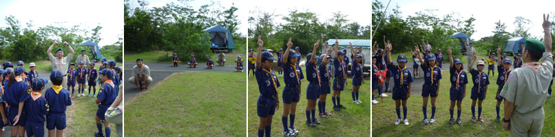大輪で集まろう。カブコールでセレモニーの始まりだ。キャンプなのでみんなでカブスカウトの『やくそく』と『さだめ』を斉唱しよう。