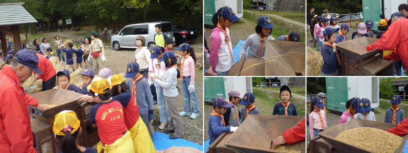 普段あまり見ることがない『とおみ』にスカウト達も興味津々。この器具は風の力を利用してお米がついていない籾を選別するものだよ。