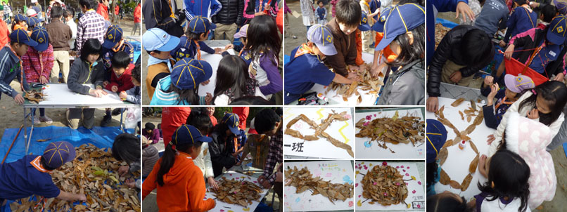 第5ポイントは『芸術が満腹を呼ぶ』。落ち葉を集め作画をする。各班とも想像豊な出来上がりで、年代の違う子どもたちでも分かりやすいゲームだ。