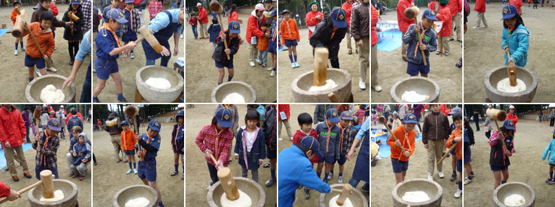 お待たせしました。ラリーの終わったところからお餅を突こう。しっかり突き上げ美味しいお餅に仕上げようね。いっぱい突いたスカウトはいっぱい食べようね。
