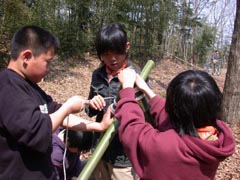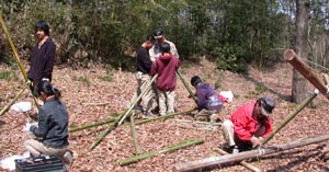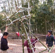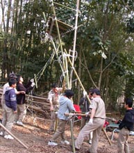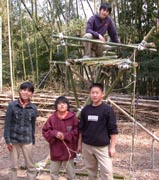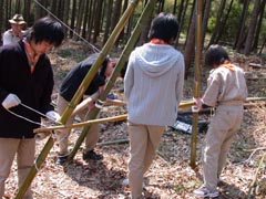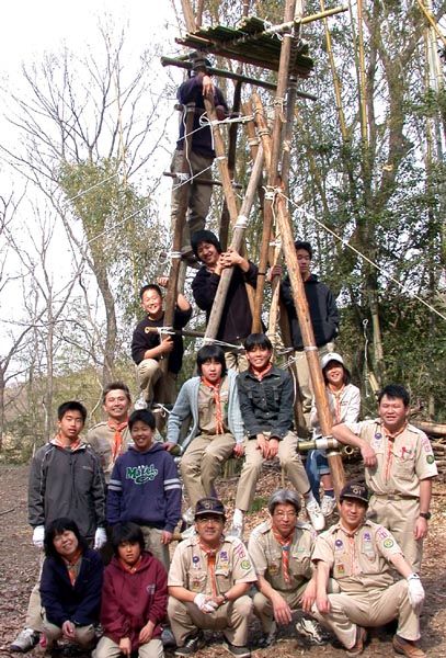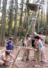 ロープワークで木材をつなぎあわせて建造物を作ること。
