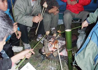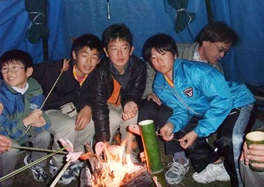 「ティッピー」の中は快適空間。外の寒さを忘れる。中で火を囲み「串焼き」を楽しむ。話しもはずむ。