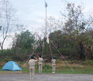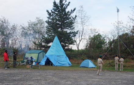 初日の天気は晴れ。予報では2日目は昼から雨だがまだ青空もあるが、寒い…。スカウト3名で朝礼をおこなう。