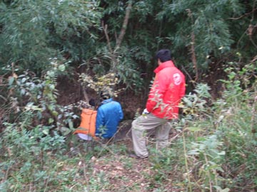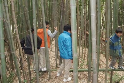 キャンプ地に着いてまず全員で材料調達から始まる。河川敷に自生している竹やぶまで装備を持って歩いていく。