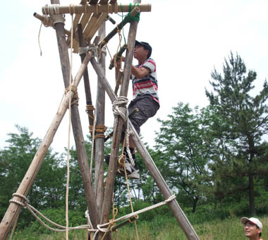 3ヵ所「張りづな」を引っ張って補強するのだが、