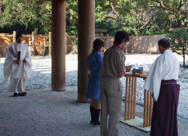 本宮拝殿前で一般参賀の人並みの側面で全員参拝したあと、お祓いを受ける。