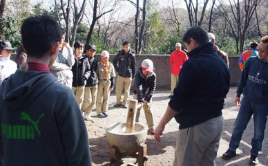 今年で3回目になる団交流会。昨年より30分早く集合して今年は「鏡餅奉納」行事に参加した。