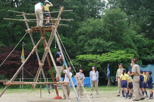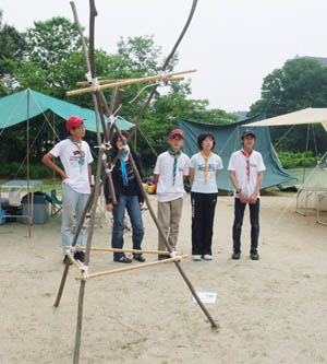 班活動の最終課題は「ミニ信号塔」作り。ミニとはいえロープワークと骨組みは実際と同じ。1時間内の製作と解体に苦労の様子が見受けられた。