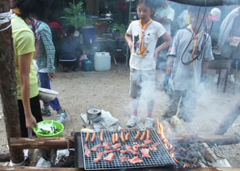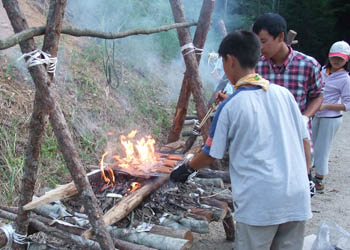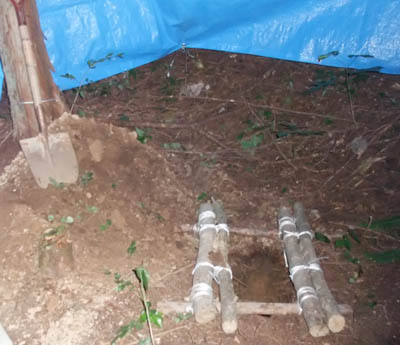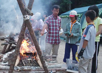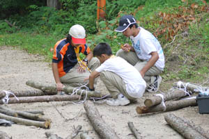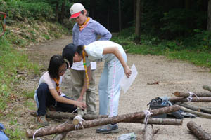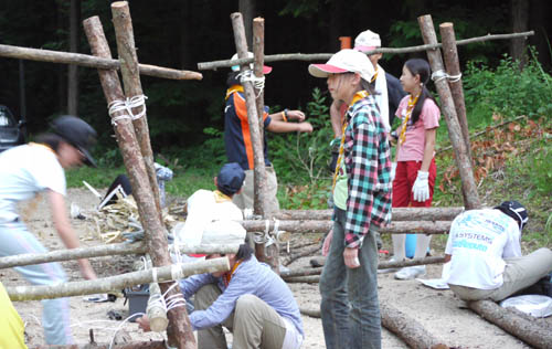 昼食をしてからすぐに開村式を行う。この場所にスカウト用テント2張りを設営する。付近に散乱する木材は「タチカマ」の材料。