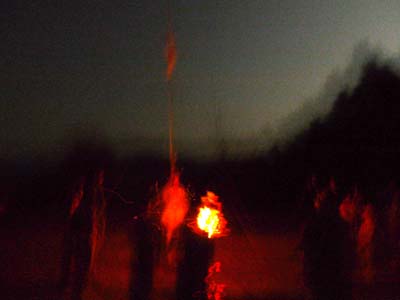 国旗・旧隊旗の前に1mほどの高さにかがり火が燃えている。