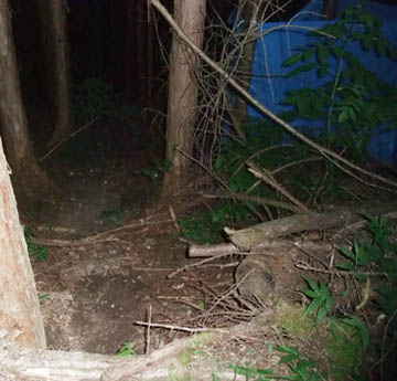 下の写真は島谷氏製作の簡易トイレ。階段もつるで作り手が込んでいる。 使用感も好評だった。これを使わないと往復15分は歩かないといけない。