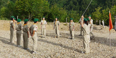 翌朝の気合入れ。 左端には新隊旗が輝いている。 右の写真はお世話になった庭先での水汲み。山からの湧水ですごく冷たくおいしい。