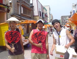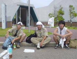 2日目かなり疲れた3人。ゴールは輪島市の重蔵神社(近くに輪島の朝市がある)。