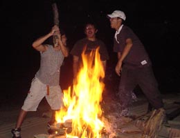 夜は,浜辺近くの駐車場で野営,夜空をバックに,キャンプファイヤーに盛り上がった。