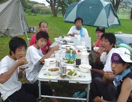 予定していた1日目の野営地(木の浦キャンプ場)に移動し,夜のミーティングではこれまでのプロジェクトを振り返り全員真剣に反省会を行った。