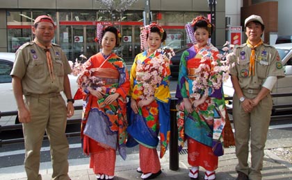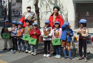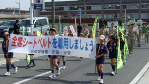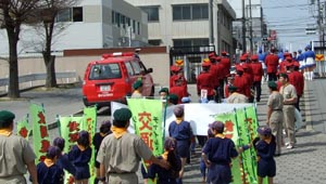 ボーイスカウトが交通安全のプラカードでアピール。