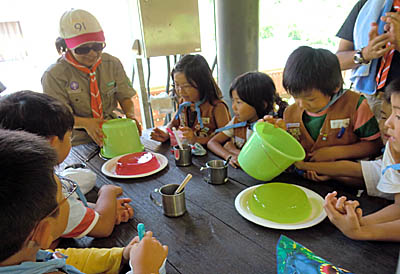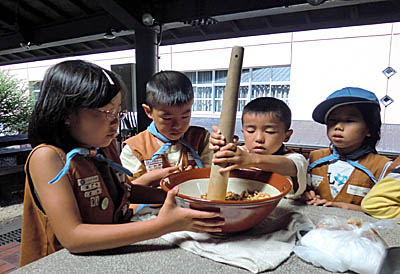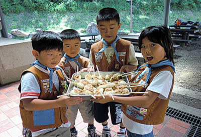 ▲朝の点検はキビシイぞ!掃除も活動のうち。 ▲今日の昼ごはんは五平餅。つまりこれからうまく作れなければお昼ナシ?!