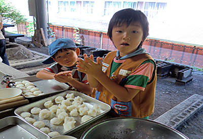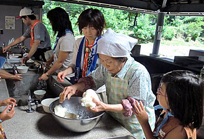 ▲地元のベテランお婆ちゃん先生の指導でおいしくつくれるかな。