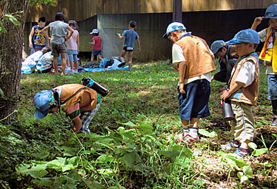 ▲集会室でご家族に楽しかった思い出のハガキ描き。何を描いた? ▲最後の活動”緑の宝探し”面白い”緑”のモノが見つけられるかな。